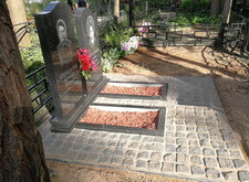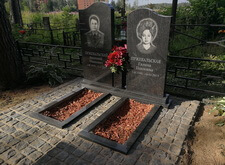 На данном участке клиент пожелал вместо уже существующего оформления места захоронения изготовить два симметричных памятника и покрыть территорию рядом с ними брусчаткой.