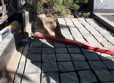 Перед тем, как закладывать участок брусчаткой, мы застелили территорию места захоронения геотекстилем, препятствующим дальнейшему прорастанию травы в швах между плитками.