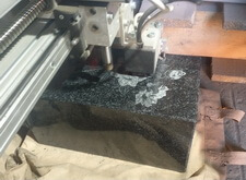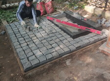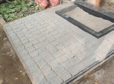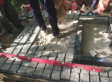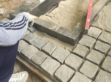 Начинаем укладывать брусчатку, параллельно монтируя цветник из гранитных балок. Кое-где целые квадратики не помещались, поэтому нам приходилось распиливать существующую брусчатку на более мелкие части.