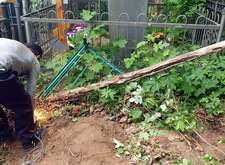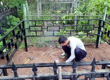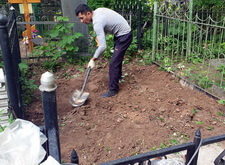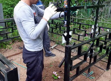 Приехав вновь на кладбище, мы взялись за очистку места захоронения от посторонних элементов: срезали болгаркой старое ограждение; пропололи сорную траву, а также разровняли землю, готовя её к покрытию бетонной плиткой.