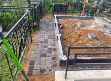 Подготавливаем территорию вокруг места захоронения к покрытию брусчаткой: ввариваем металлическую полосу и укрываем землю геотекстилем.