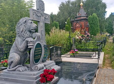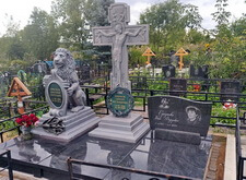 Устанавливаем надгробья. Справа располагается старый гранитный памятник, слева – композиция, изготовленная из полимеров. Скульптуры предоставлены клиентом и были сделаны в другой мастерской, сами они лёгкие, по текстуре и цвету похожи на камень.