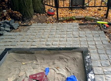 Приступаем к созданию наземного покрытия. По просьбе клиента в центре участка будет находиться широкий цветник, остальную же территорию предполагается замостить гранитной брусчаткой. Засыпаем геотекстиль пескобетонной смесью и укладываем брусчатку, параллельно монтируя цветник из гранитных балок.